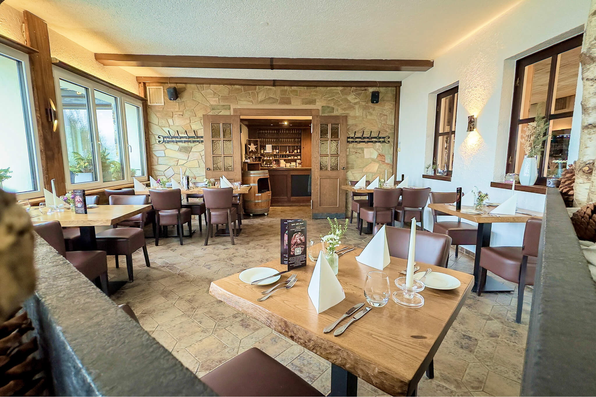 Im Innenbereich bietet der gesamte Gastraum Platz für 110 Personen. Der Gastraum ist in drei Räume geteilt, Nauroder Zimmer, Kamin Zimmer und der Panoramasaal. Der Panoramasaal bietet im Innenbereich den größten Bereich mit 60 Sitzplätzen.